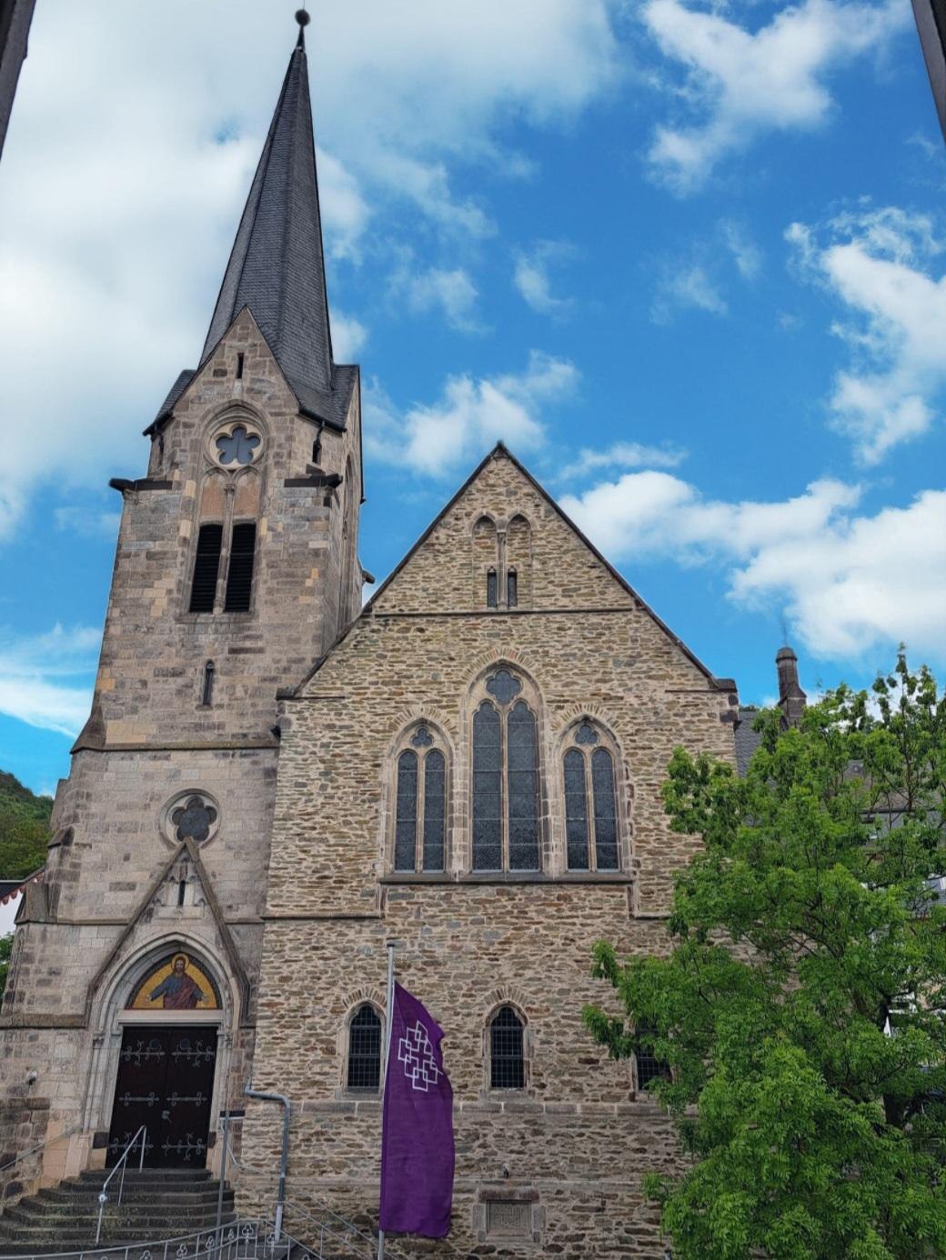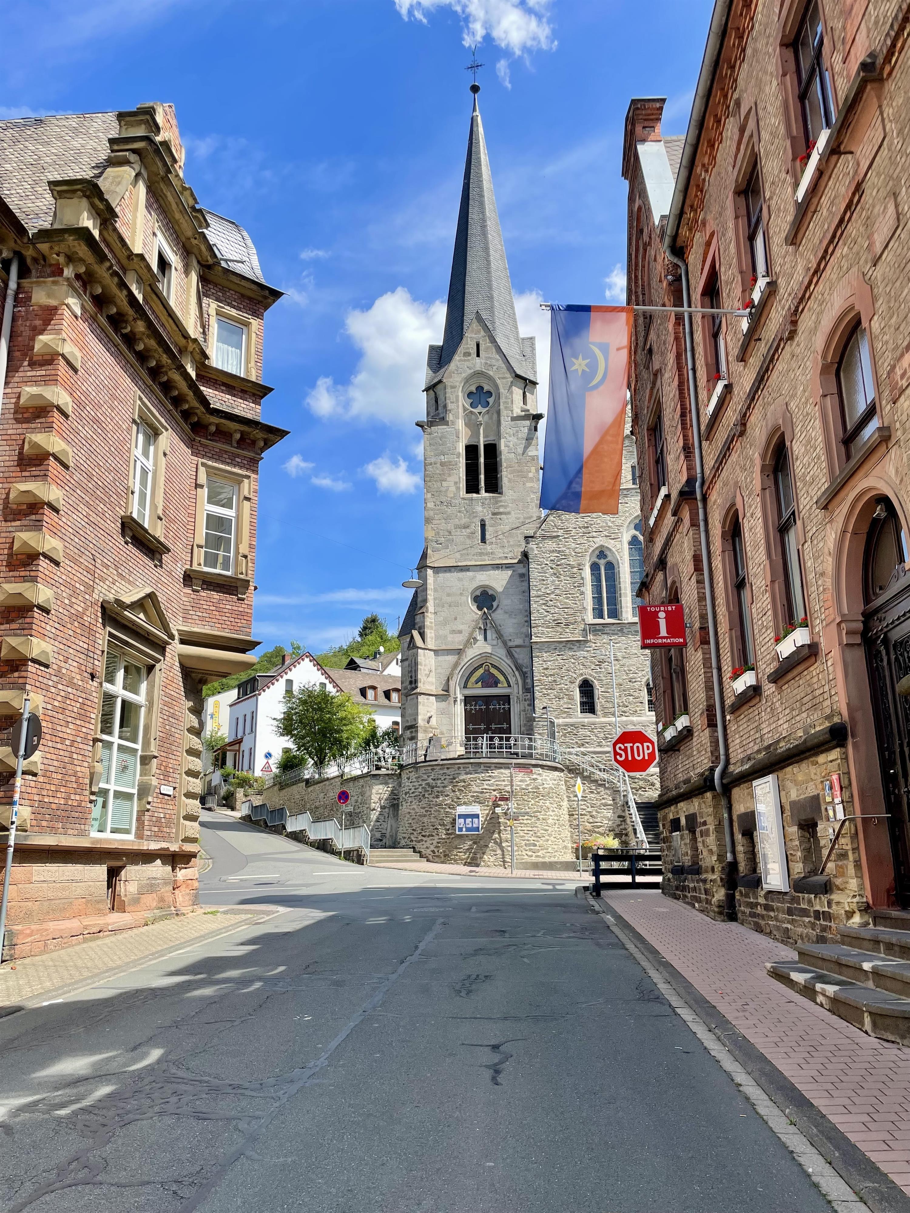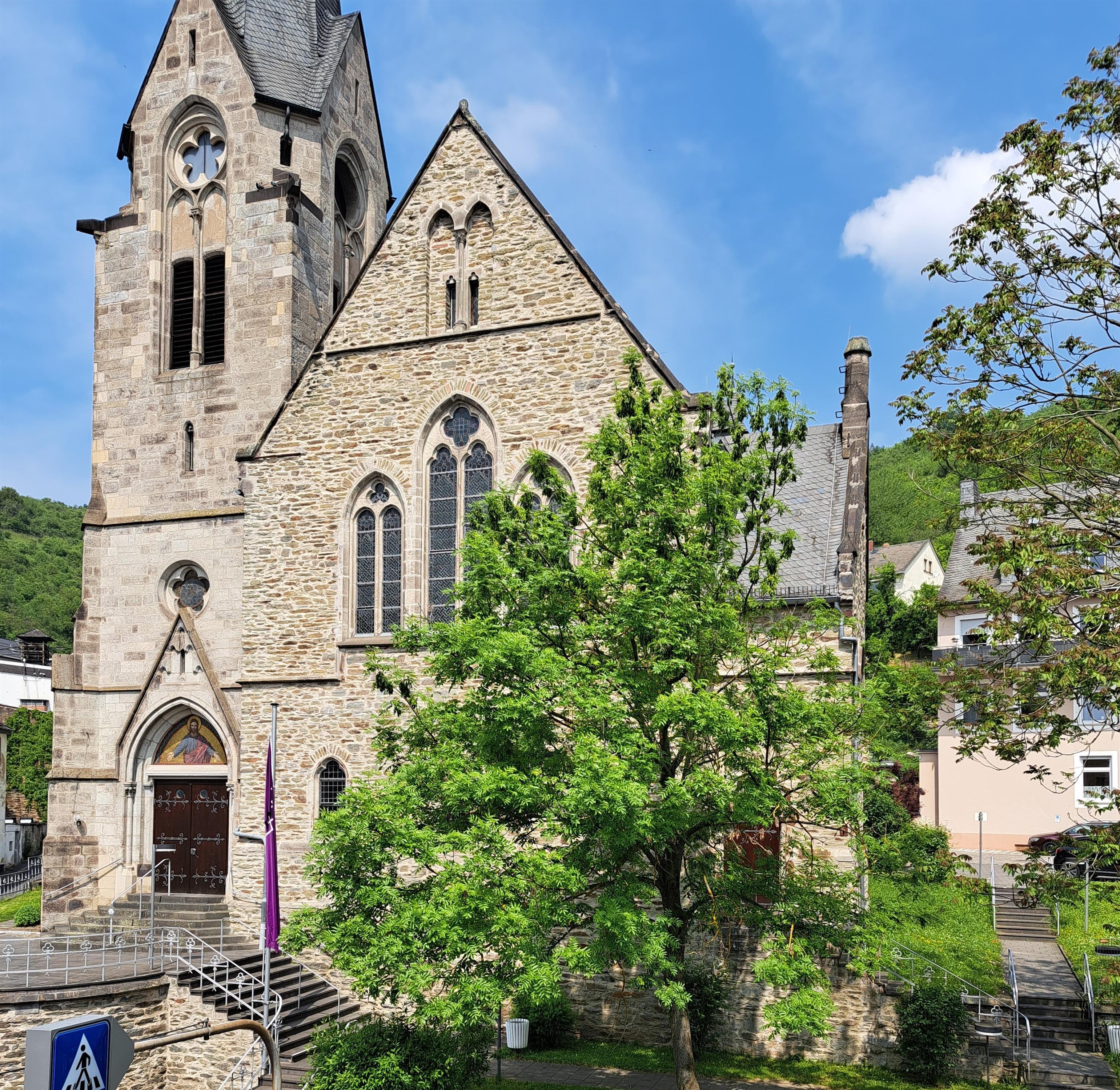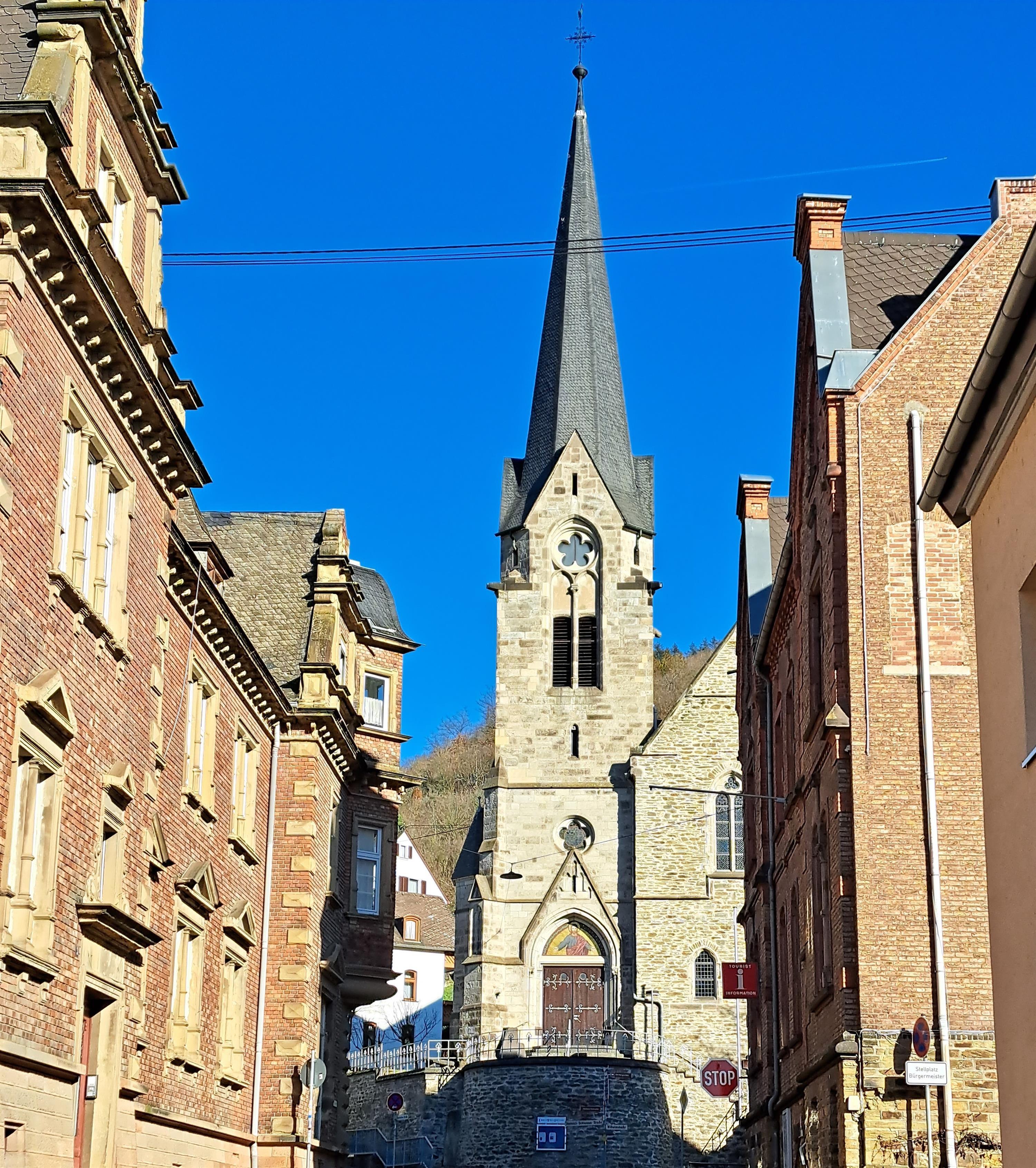 Die ev. Markuskirche. Die Grundsteinlegung war am 22.05.1898. Ein Jahr später, als der Bau weit vorangeschritten war, stürzte der fast vollendete Turm unter gewaltigem Getöse ein und riß einen großen Teil der vorderen und linken Seitenwand der Kirche mit sich. Der neue Turm wurde niedriger und aus anderem Gestein errichtet. Am 09. Mai 1901 konnte die Kirche eingeweiht werden.