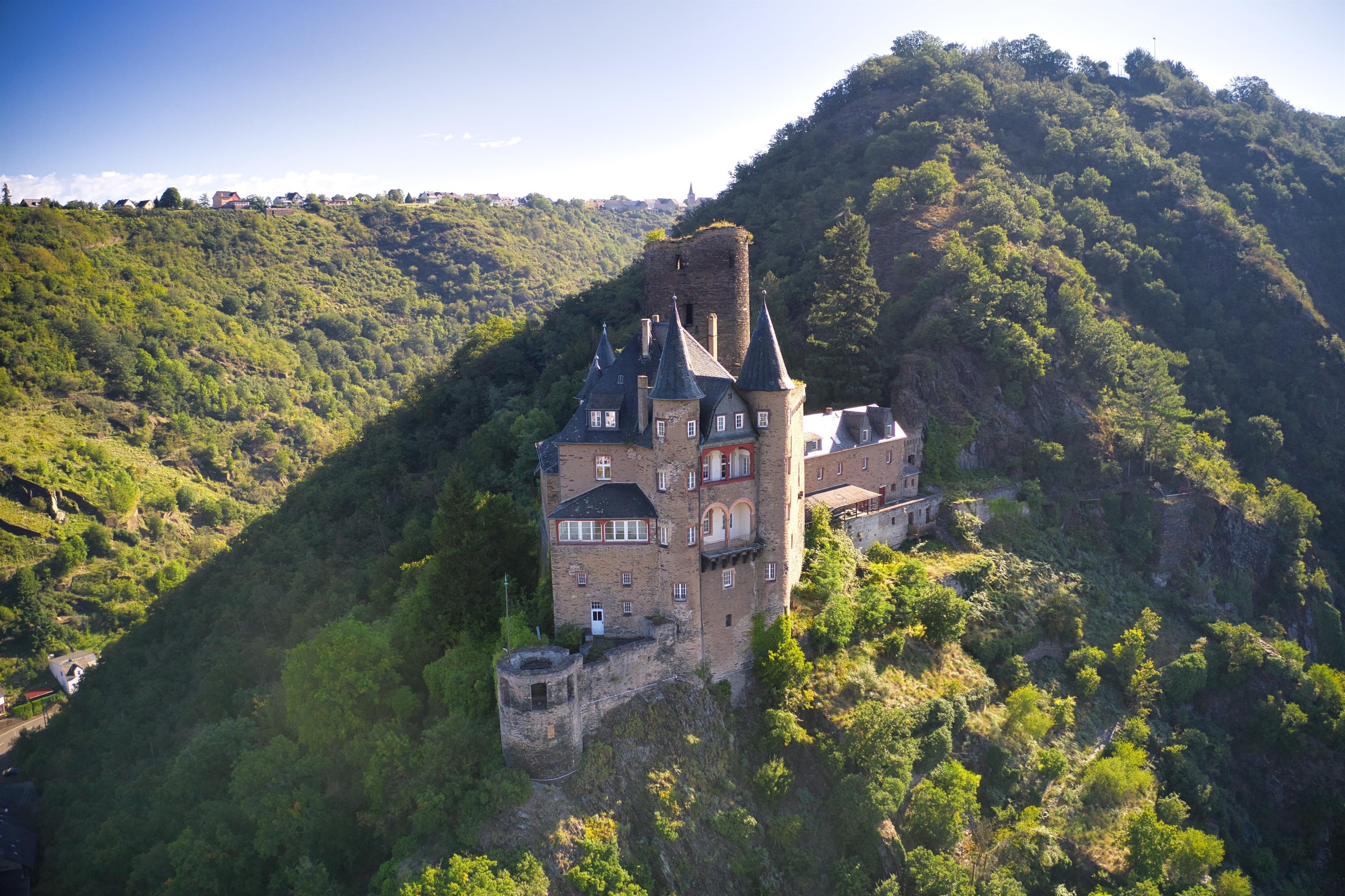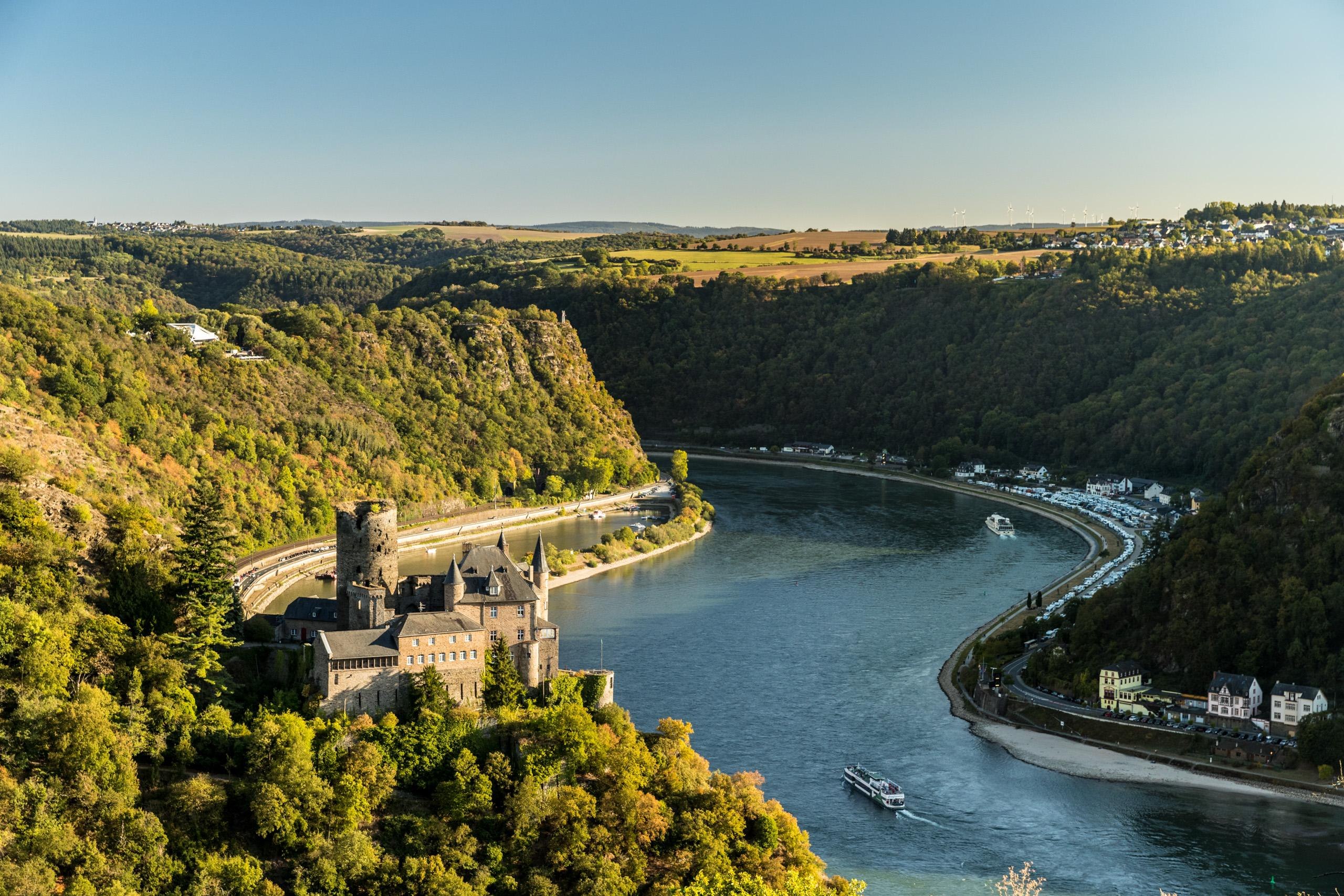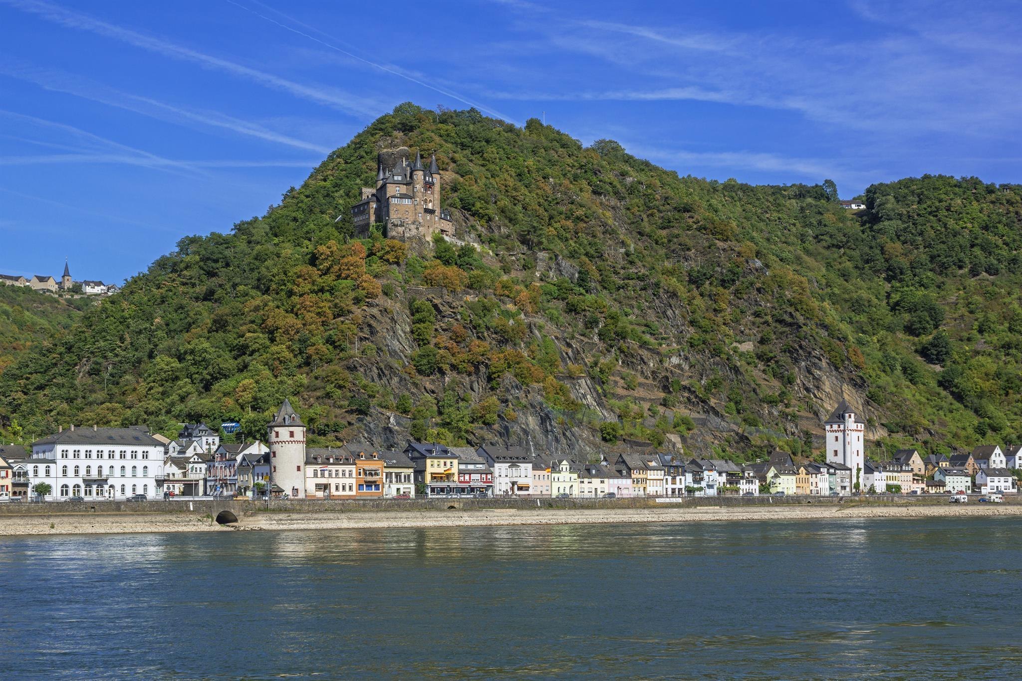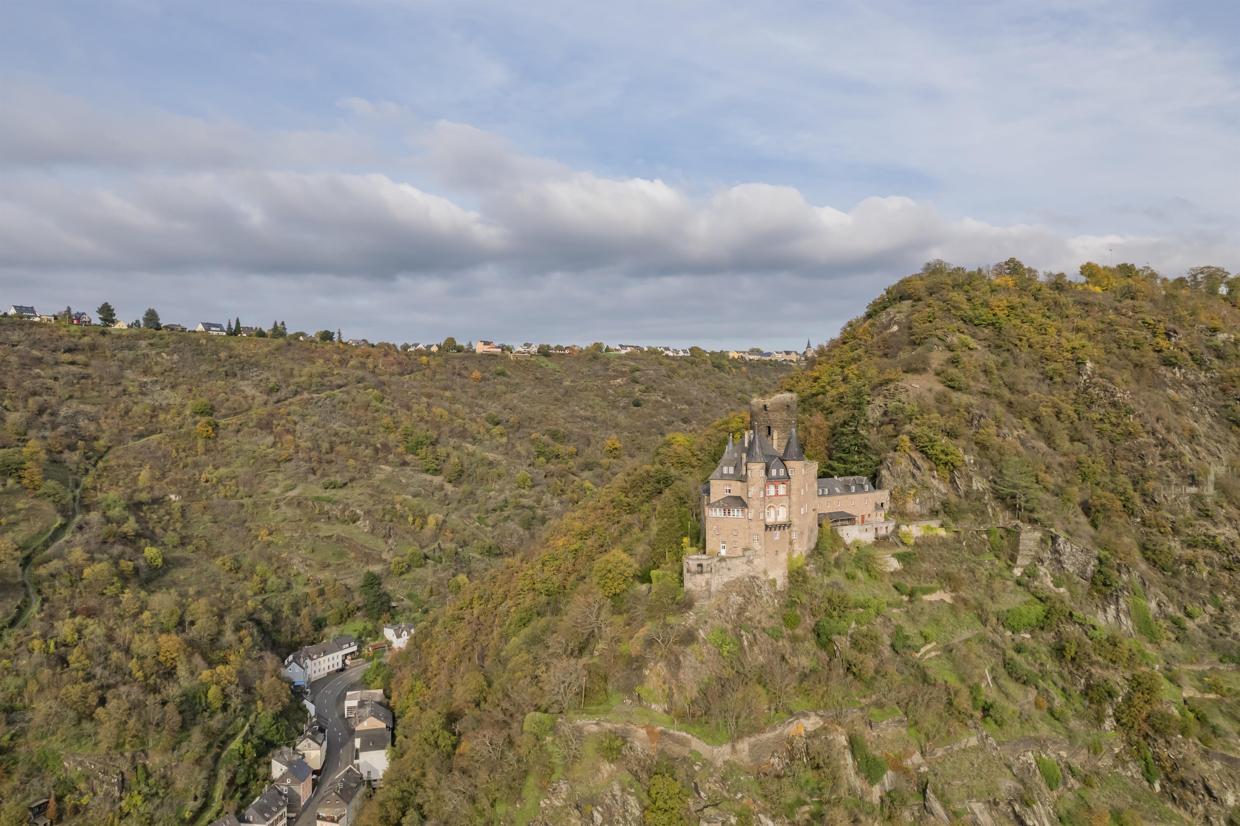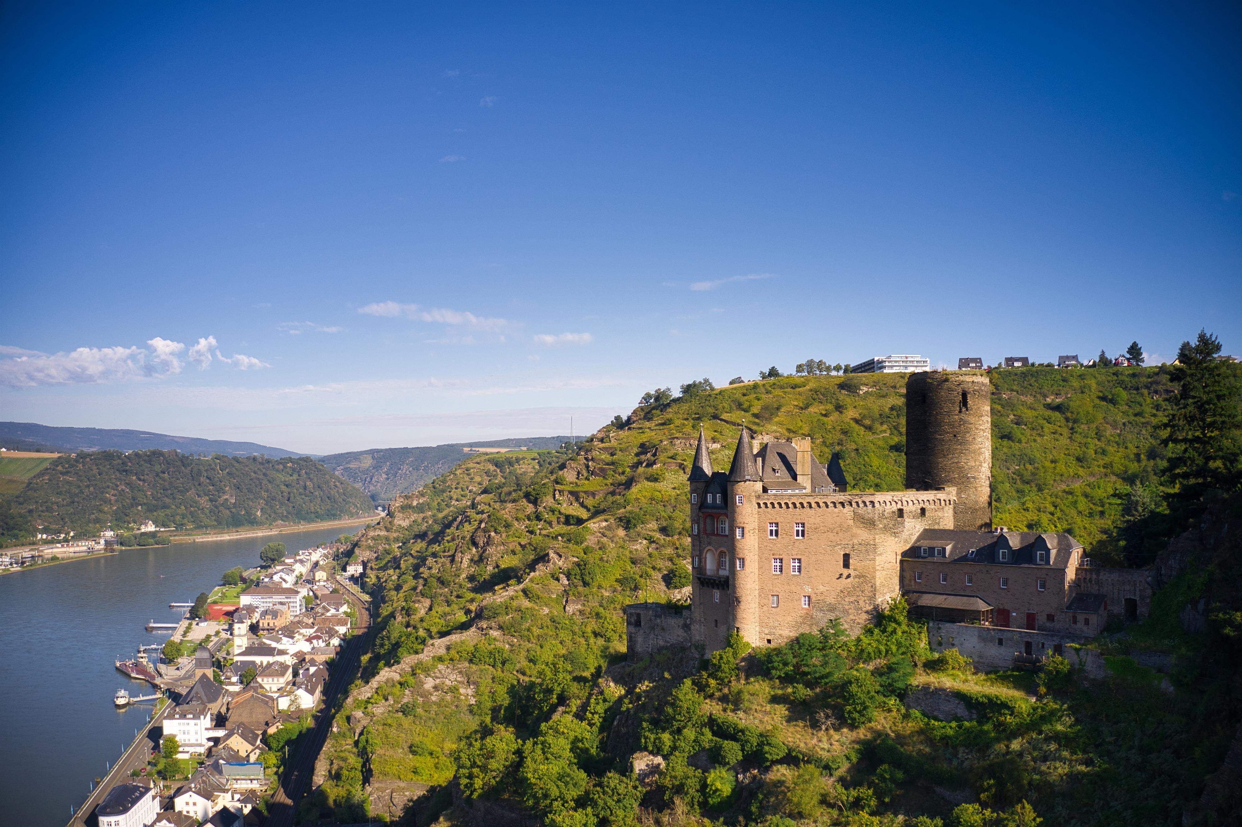 The name "Katz" was given to the castle in St. Goarshausen by popular opinion, which actually originated as Burg Neu-Katzenelnbogen in 1371. With it, the Counts of Katzenelnbogen aimed to protect their possessions along the Rhine, particularly the customs office in the opposing St. Goar - as well as deliberately establishing a counterbalance to the Kurtrier castle "Maus", which threatened their customs processing. Like many Rhine castles, it ultimately could not withstand the French troops, and the castle was destroyed in 1806. It took almost a century before a historicized reconstruction from 1898 to 1899 transformed the ruins into a magnificent residence.