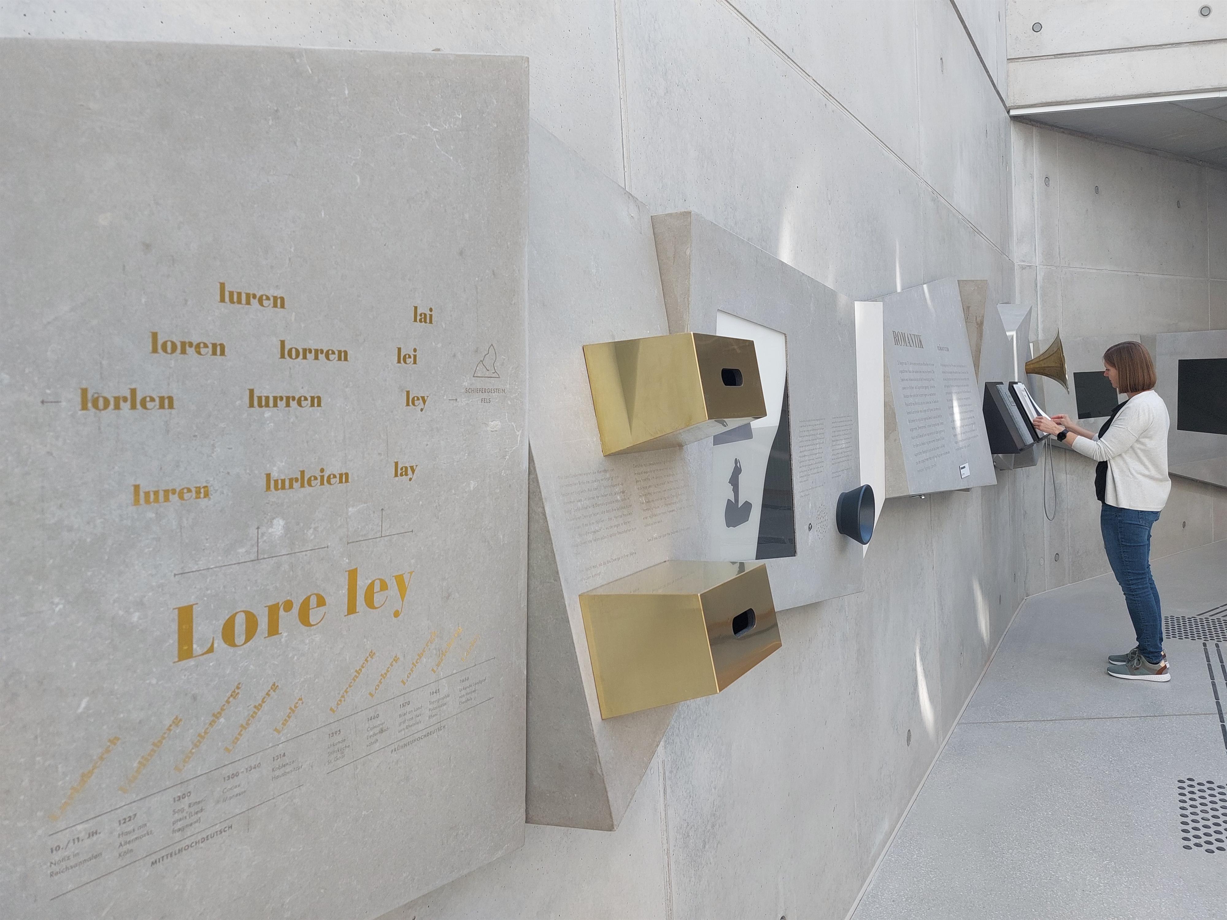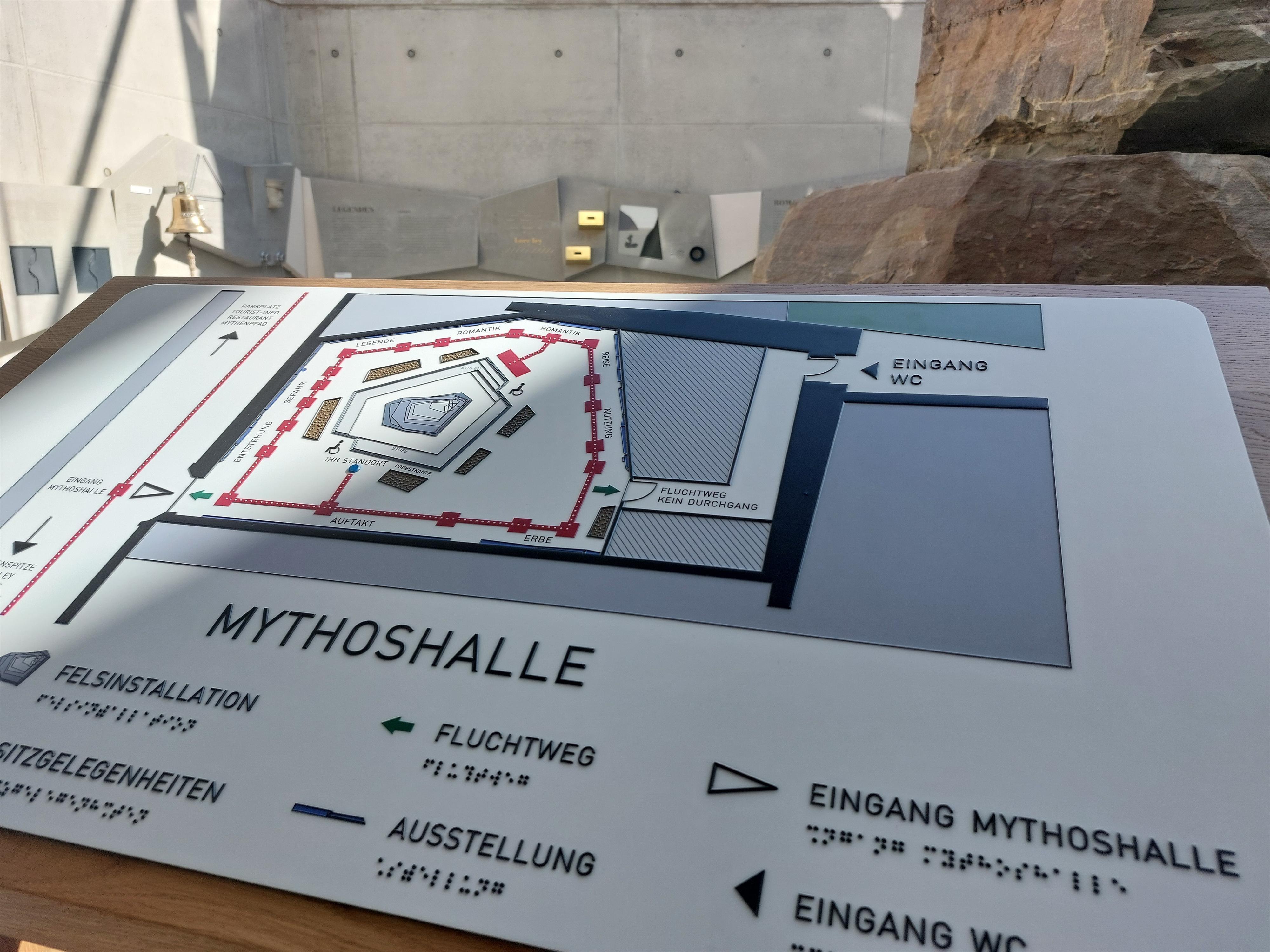 In het centrum van de Mythoshall staat een rotsinstallatie, die de oorsprong en latere mythologische betekenis van de Loreley-rots visualiseert en emotioneel beleefbaar maakt: Uit de grond groeit een zich defragmenterende rotsformatie, die door het open ruimteplafond van de tentoonstellingshal naar de daarboven liggende gestileerde Glazen Rots steekt. Van steen wordt glas, dat symbolisch de mythen en geheimen onthult.